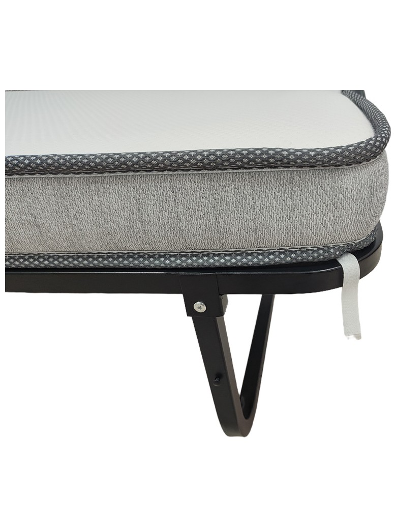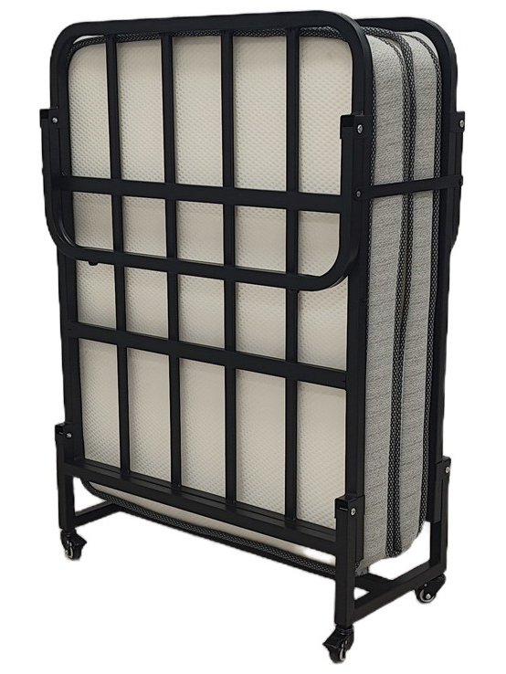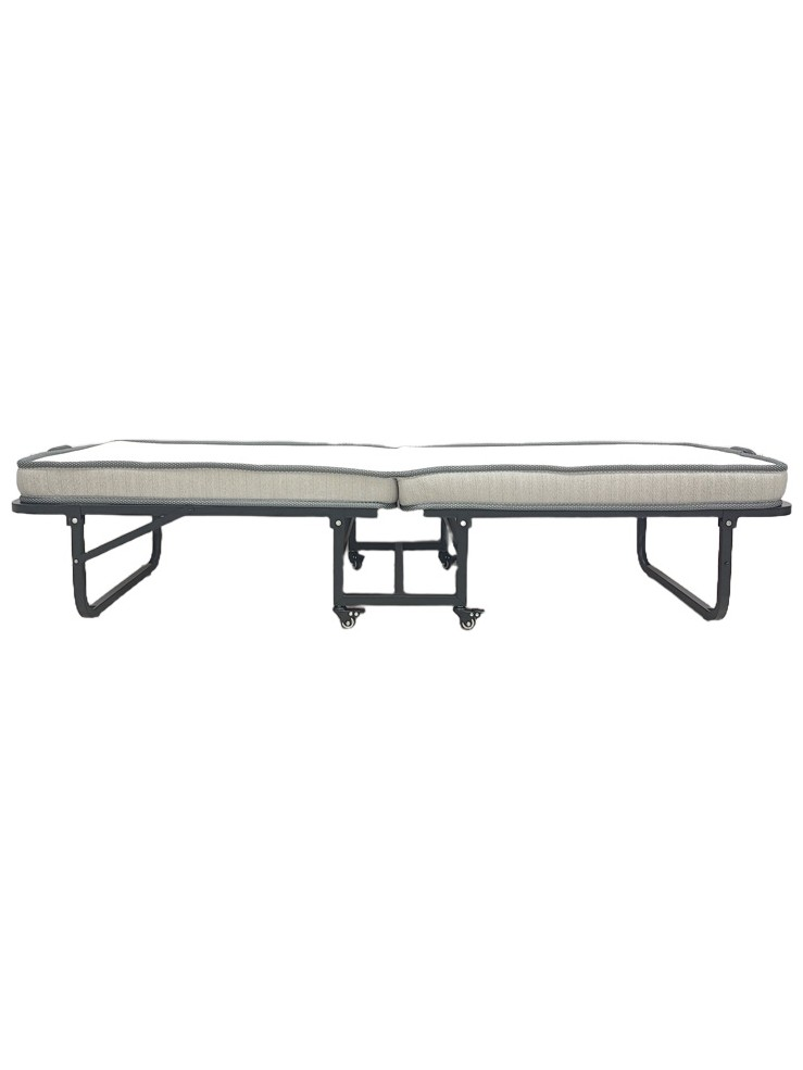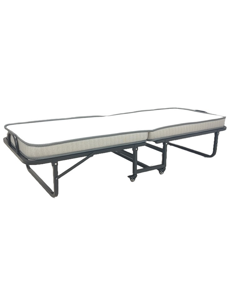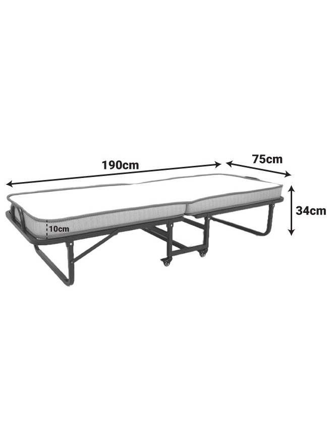 Το κρεβάτι συνοδεύεται από ένα άνετο στρώμα, το οποίο διπλώνει αρμονικά μαζί με τον σκελετό, μειώνοντας στο ελάχιστο τον απαιτούμενο χώρο. Οι ενσωματωμένες ρόδες κάτω από τη βάση παρέχουν απαράμιλλη ευκολία στη μετακίνηση, καθιστώντας το προϊόν ιδανικό για γρήγορες αλλαγές διάταξης στο χώρο ή για αποθήκευση σε ντουλάπες και αποθήκες.