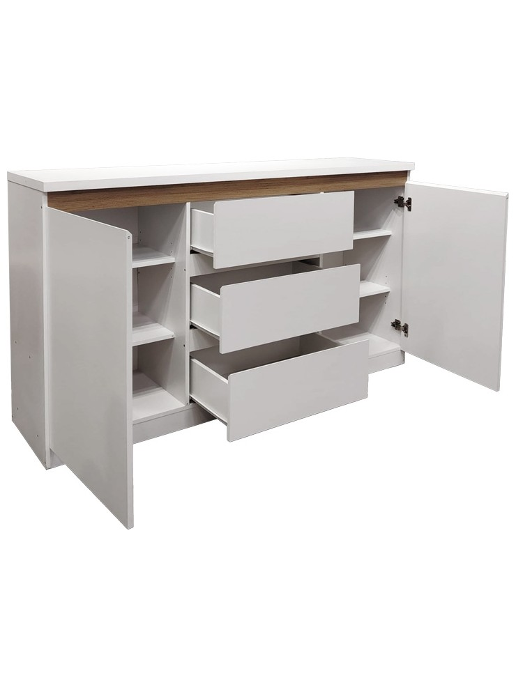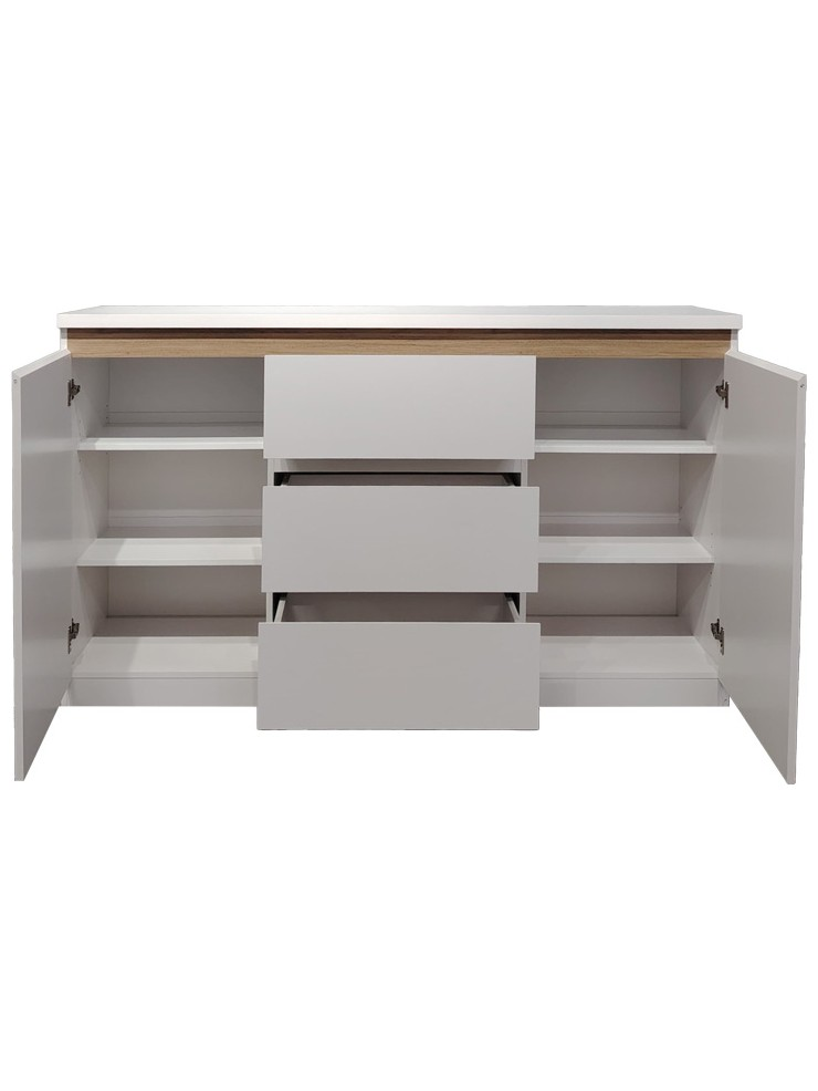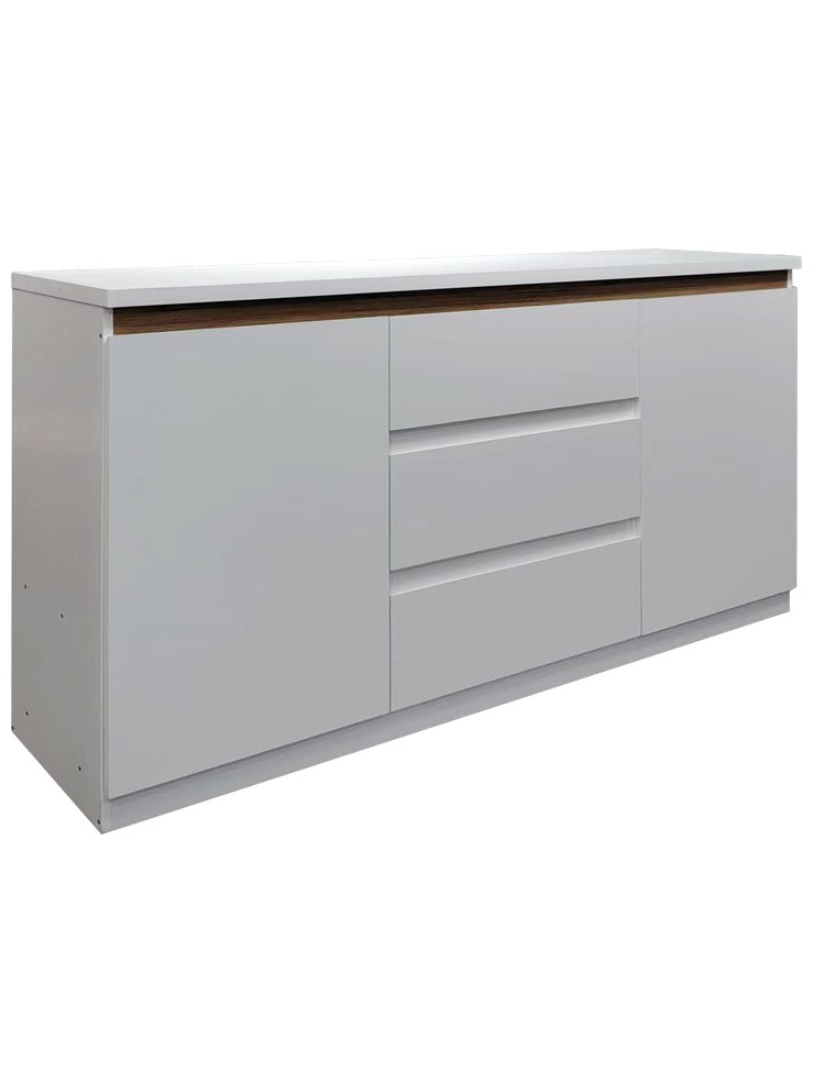 Ανανεώστε την αισθητική του χώρου σας με τον κομψό και λειτουργικό μπουφέ Chiemo. Αυτό το έπιπλο αποθήκευσης συνδυάζει τον σύγχρονο μινιμαλισμό με την πρακτικότητα, προσφέροντας άφθονο χώρο για την οργάνωση των αντικειμένων σας. Διαθέτει δύο ευρύχωρα ντουλάπια με εσωτερικά ράφια και τρία άνετα συρτάρια, παρέχοντας ευελιξία για την αποθήκευση σερβίτσιων, λευκών ειδών ή άλλων προσωπικών αντικειμένων.