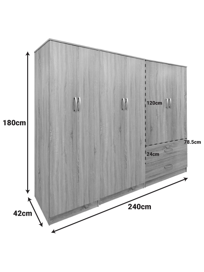 - Περιλαμβάνει εξι πόρτες, εσωτερικά φέρει ράγα για κρεμάστρες ενώ κάτω φέρει δύο μεγάλα συρτάρια για την αποθήκευση ρούχων και αξεσουάρ.