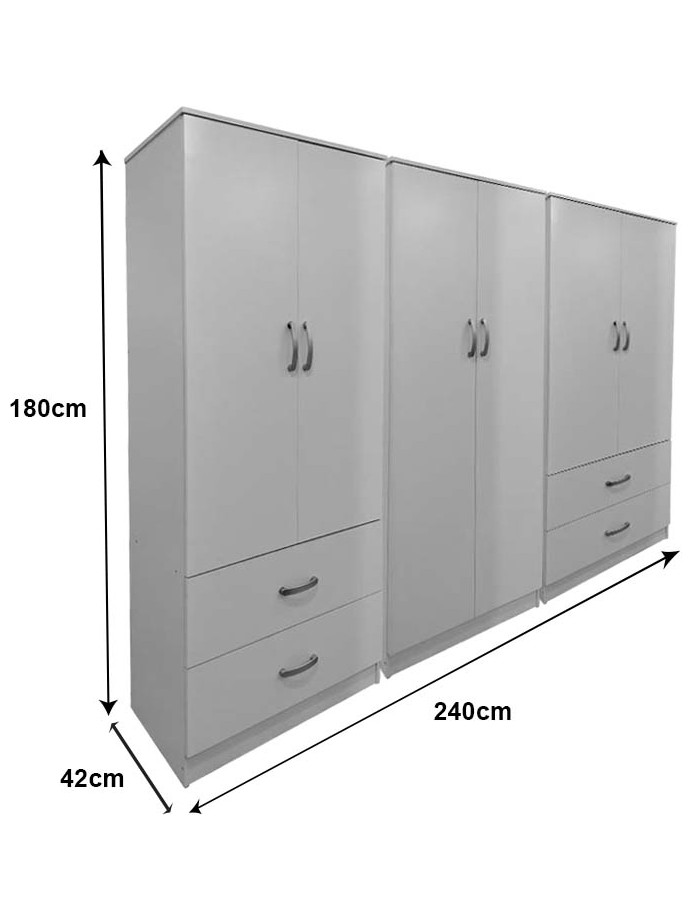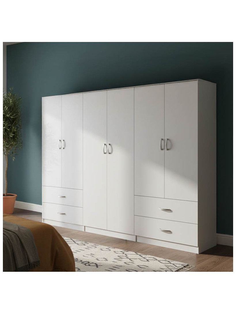 - Περιλαμβάνει εξι πόρτες, εσωτερικά φέρει ράγα για κρεμάστρες ενώ κάτω φέρει τεσσερα μεγάλα συρτάρια για την αποθήκευση ρούχων και αξεσουάρ.