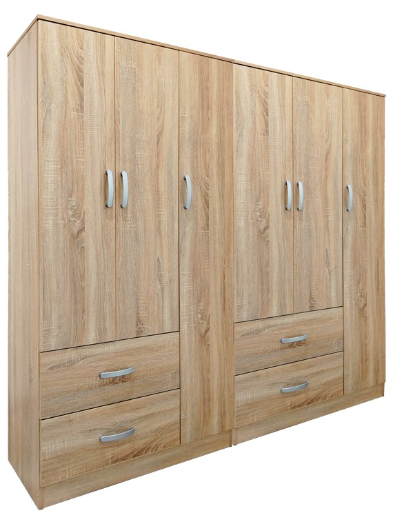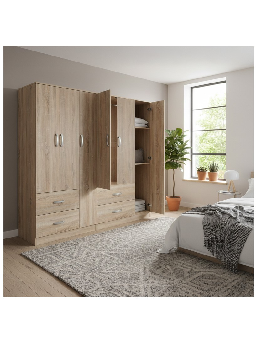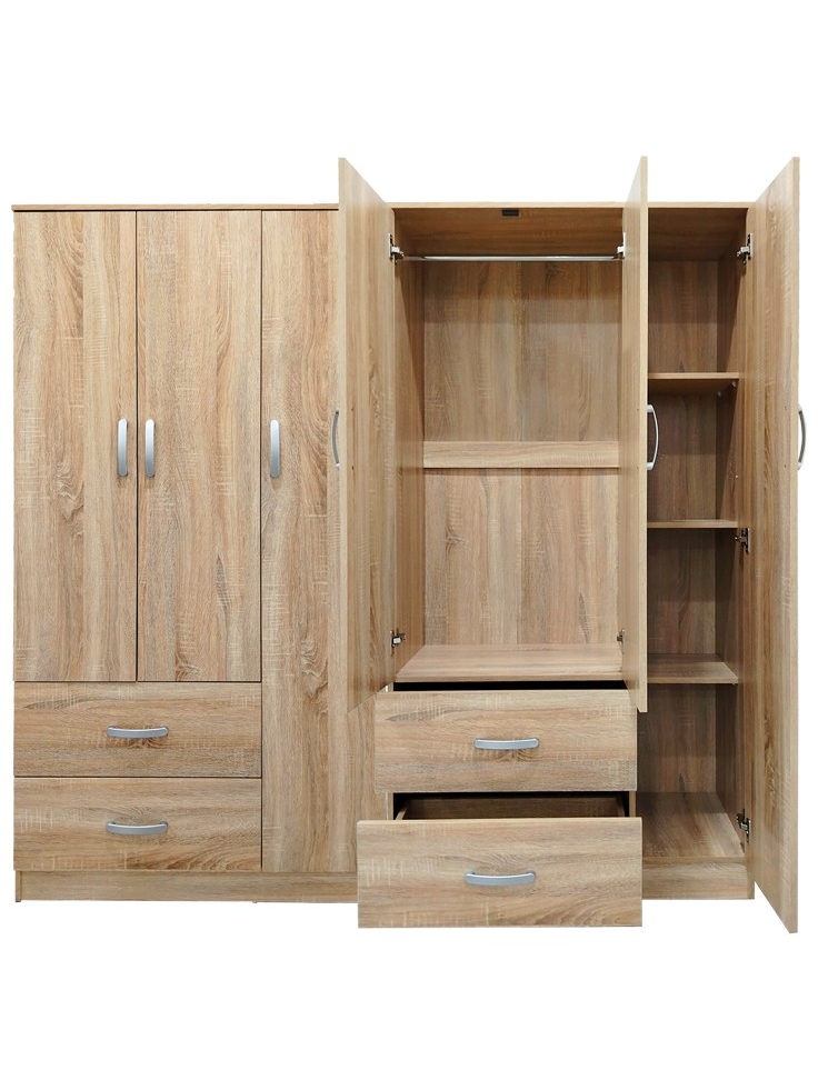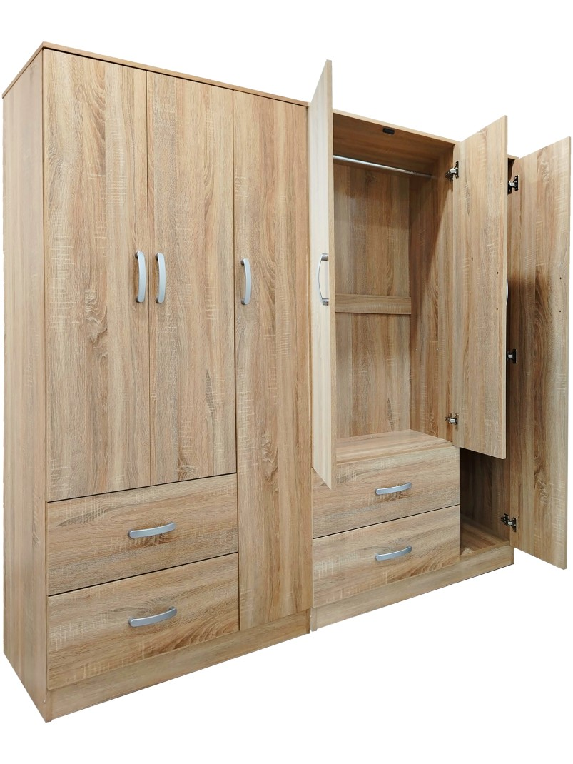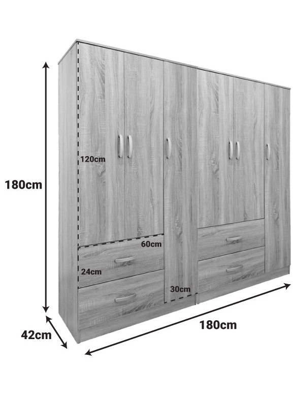 - Περιλαμβάνει έξι πόρτες, εσωτερικά φέρει ράγα για κρεμάστρες και ράφια ενώ κάτω φέρει τέσσερα μεγάλα συρτάρια για την αποθήκευση ρούχων και αξεσουάρ.