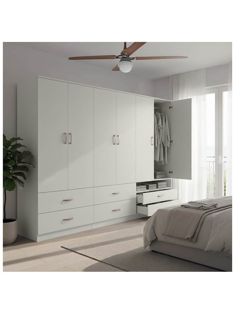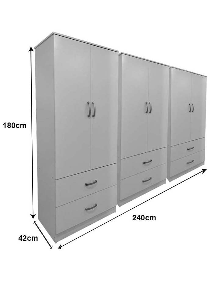 - Περιλαμβάνει εξι πόρτες, εσωτερικά φέρει ράγα για κρεμάστρες ενώ κάτω φέρει εξι μεγάλα συρτάρια για την αποθήκευση ρούχων και αξεσουάρ.