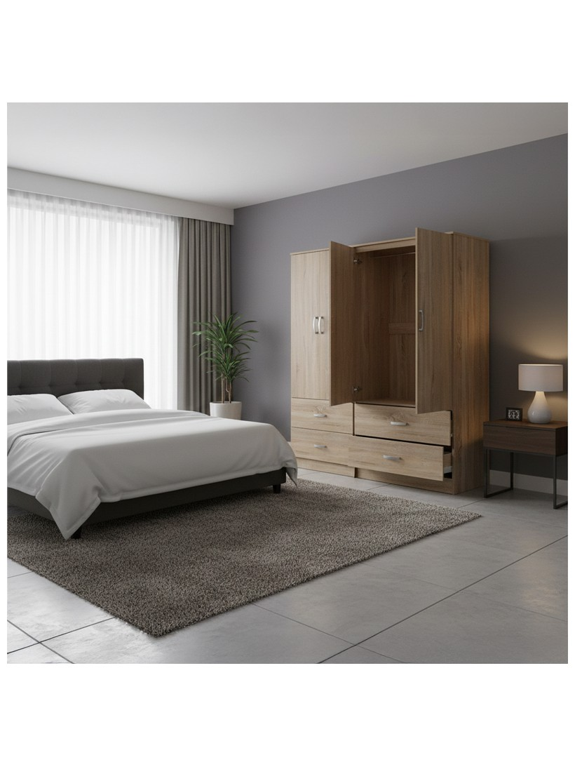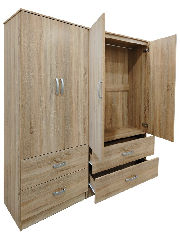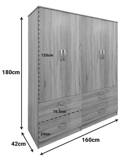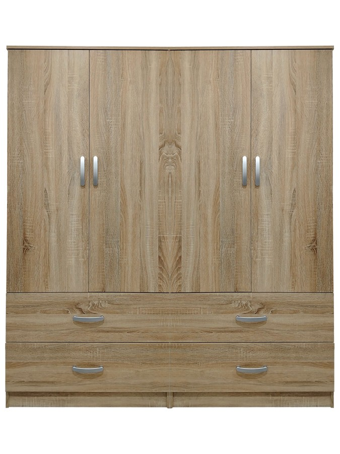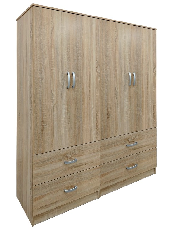 - Περιλαμβάνει τέσσερις πόρτες, εσωτερικά φέρει ράγα για κρεμάστρες ενώ κάτω φέρει τέσσερα μεγάλα συρτάρια για την αποθήκευση ρούχων και αξεσουάρ.