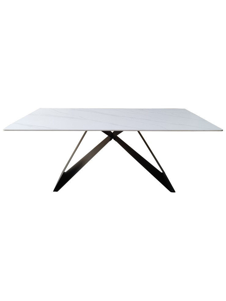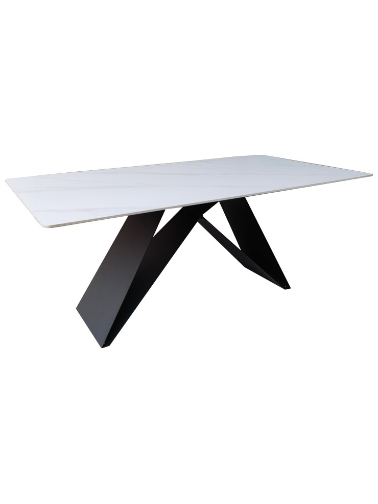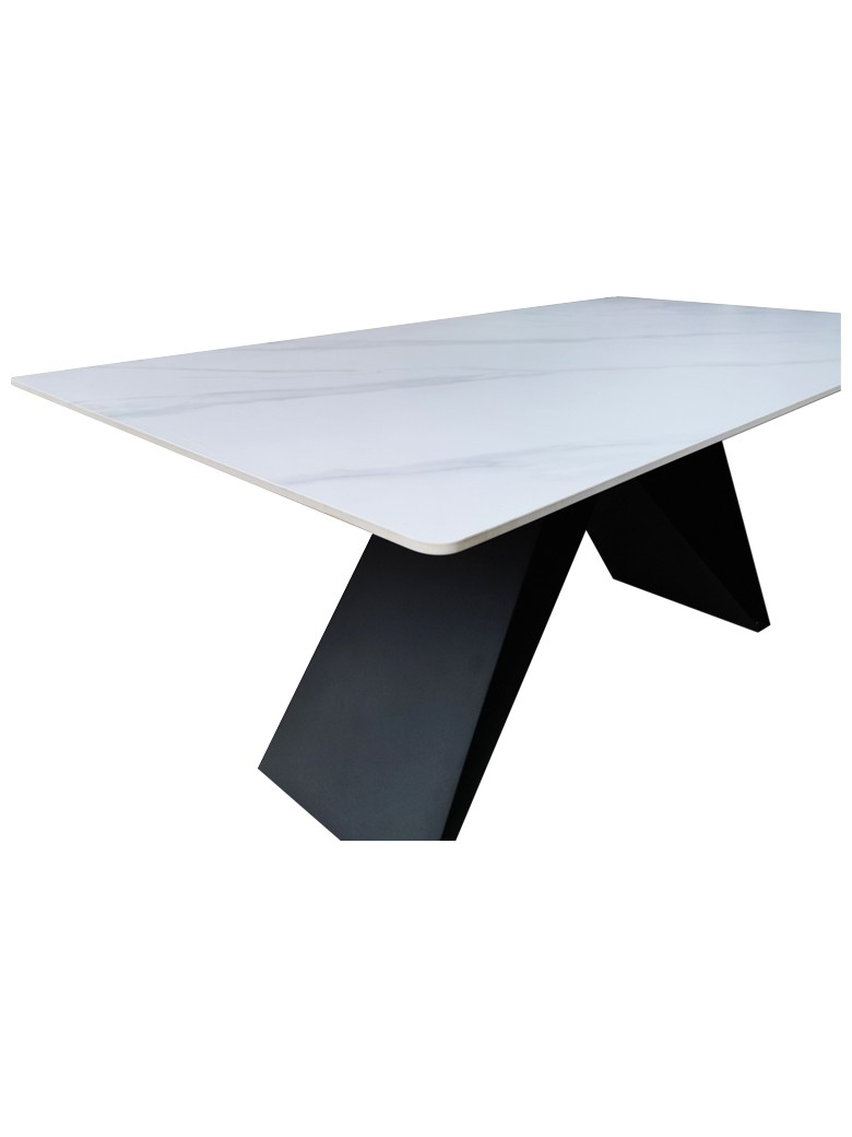 Με την κομψή του επιφάνεια σε λευκό χρώμα όψης μαρμάρου και τη μοντέρνα, γεωμετρική του βάση σε μαύρο χρώμα, αυτό το τραπέζι είναι η επιτομή της σύγχρονης αισθητικής. Ο σχεδιασμός του δεν είναι απλά όμορφος, αλλά και λειτουργικός, προσφέροντας σταθερότητα και αντοχή.