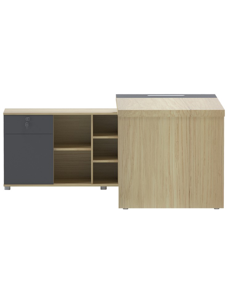 - Βοηθητικό γραφείο: Το γραφείο - αριστερη γωνία στηρίζεται σε ερμάριο που διαθέτει πολλαπλούς αποθηκευτικούς χώρους: Συρτάρι με κλειδαριά, ντουλάπι και ράφια. Κατασκευασμένα από μοριοσανίδα υψηλής ποιότητας με επένδυση μελαμίνης.