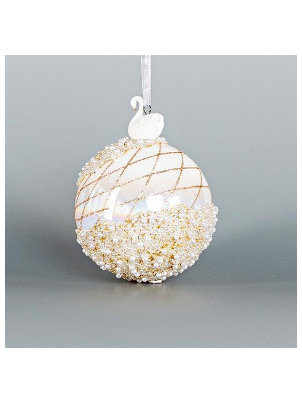 Γυαλινη Μπαλα, Ιριδιζουσα Λευκη με Πορσελανινο Κυκνο, με Χαντρες, 1τμχ, 10cm