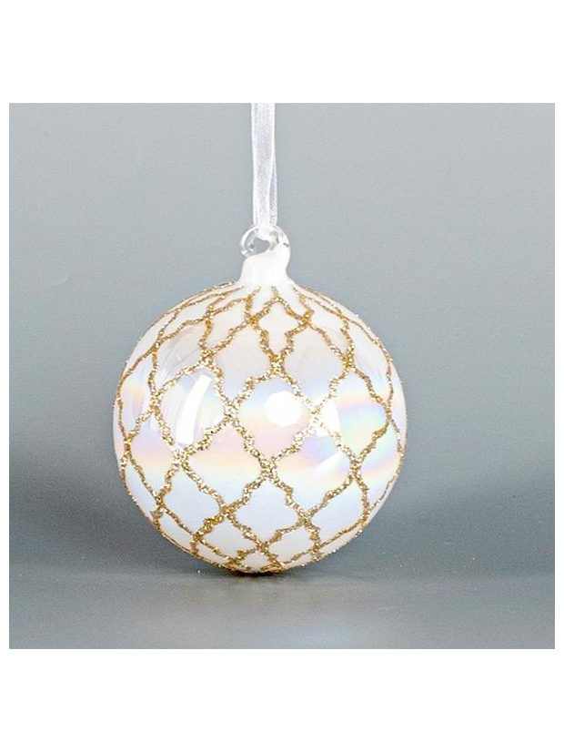 Γυαλινη Μπαλα, Ιριδιζουσα Λευκη, με Χρυσα Σχεδια, 1τμχ, 8cm