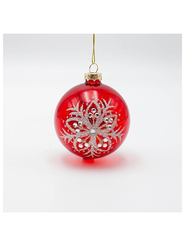 Γυαλινη Μπαλα, Κοκκινη με Ασημι Λουλουδι, σετ 4τμχ, 8cm