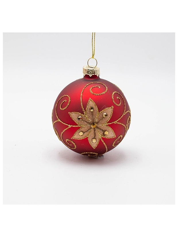 Γυαλινη Μπαλα, Κοκκινη με Χρυσο Λουλουδι, σετ 4τμχ, 8cm