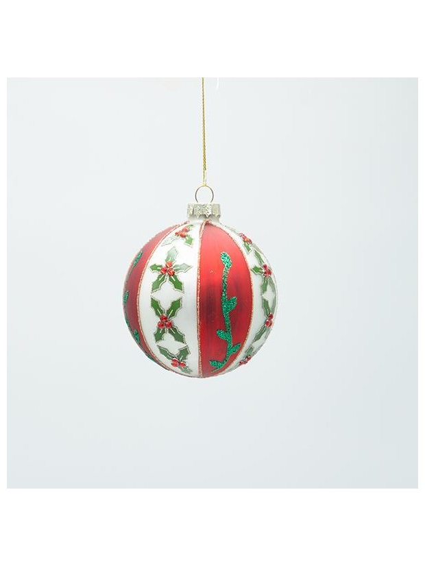 Γυαλινη Μπαλα, Λευκη με Κοκκινο και Σχεδια Γκι, σετ 4τμχ, 8cm