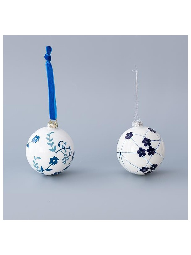 Γυαλινη Μπαλα, Λευκη με Μπλε Λουλουδια, 2 Σχεδια, σετ 4τμχ, 8cm