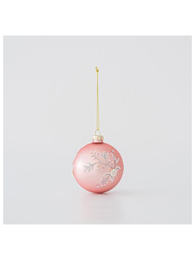 Γυαλινη Μπαλα, Ροζ, με Λευκα Λουλουδια, σετ 4τμχ, 10cm