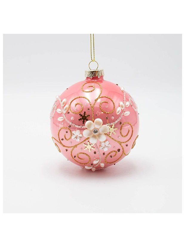 Γυαλινη Μπαλα, ροζ με Λευκο Περλε Λουλουδι, σετ 4τμχ, 10cm