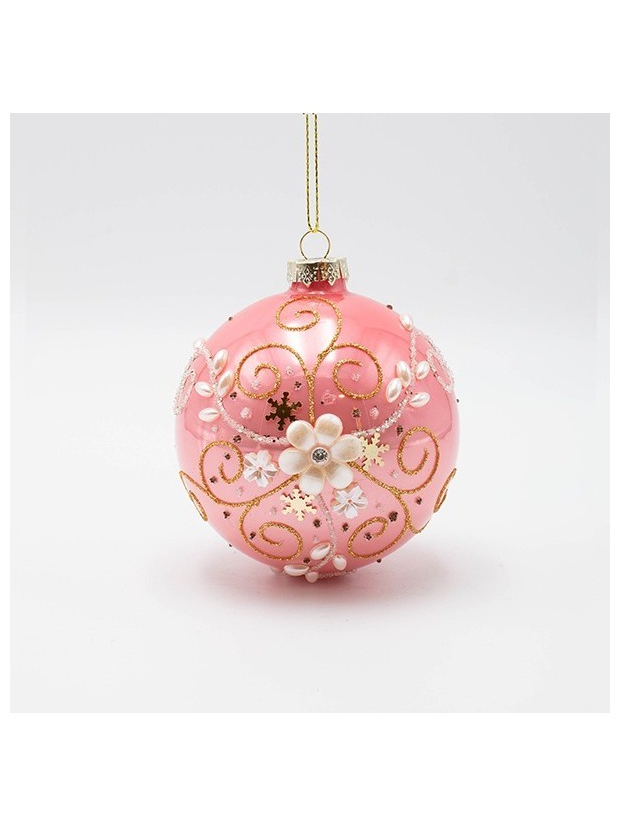 Γυαλινη Μπαλα, ροζ με Λευκο Περλε Λουλουδι, σετ 4τμχ, 8cm