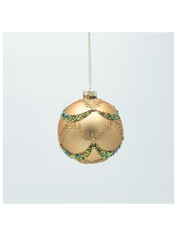 Γυαλινη Μπαλα, Χρυση ματ με Πρασινες Πετρες, σετ 4τμχ, 10cm