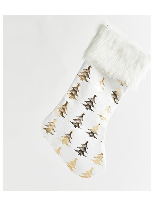 Καλτσα, Ασπρη με Χρυσα Δεντρακια, Βελουδο, 45cm
