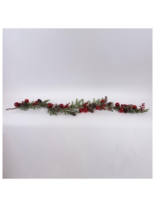 Κλαδα Χιονισμενη με Κοκκινες Μπαλες και Κουκουναρια, 170cm