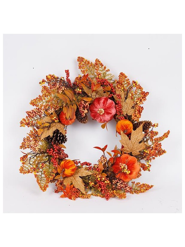 Στεφανι με Φυλλα Σφενδαμου και Πορτοκαλι Βελουδινες Κολοκυθες, 60cm