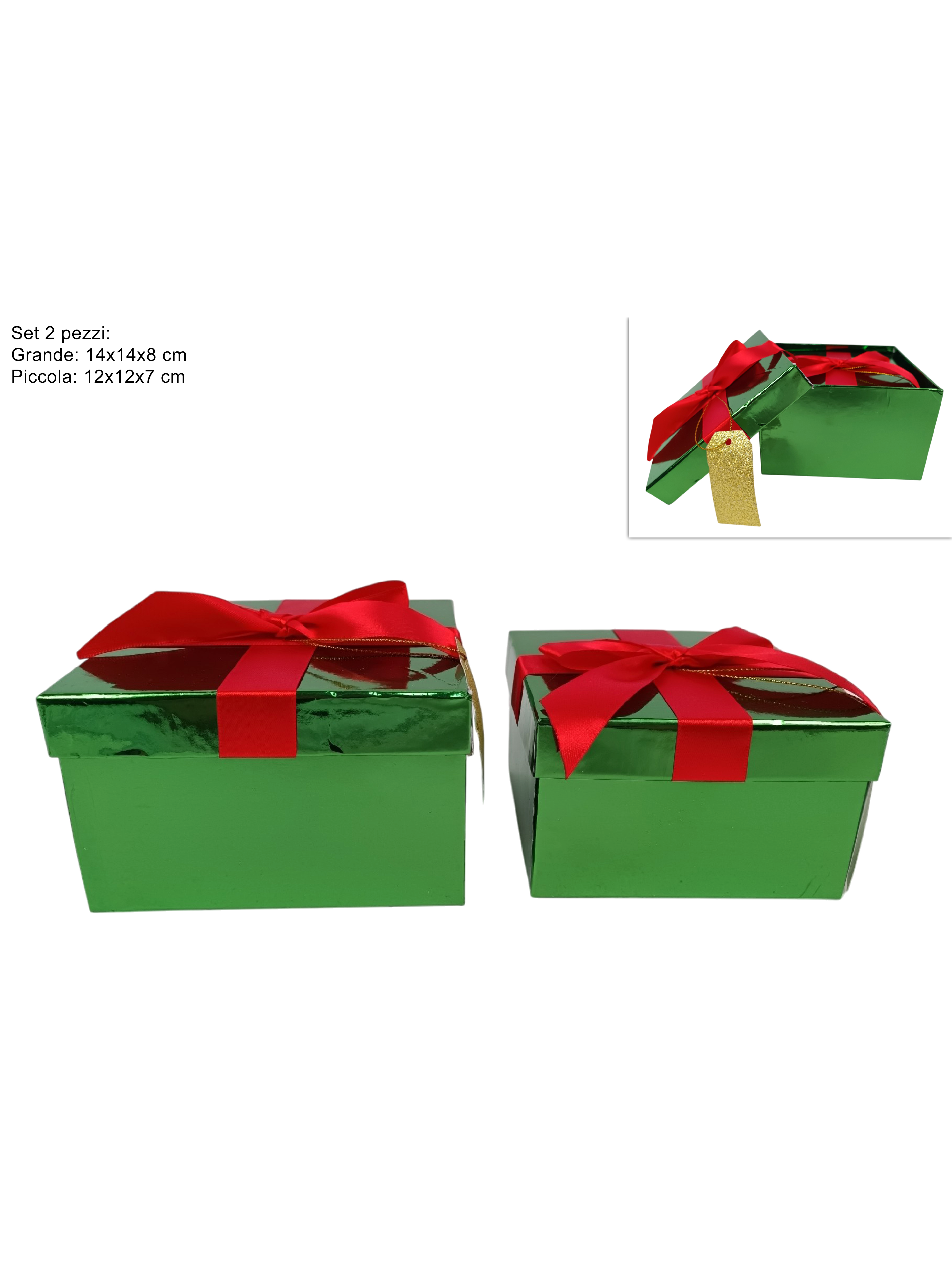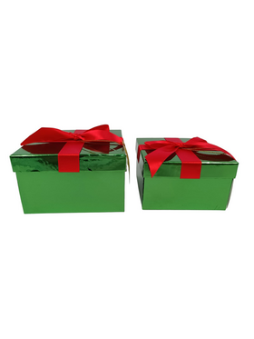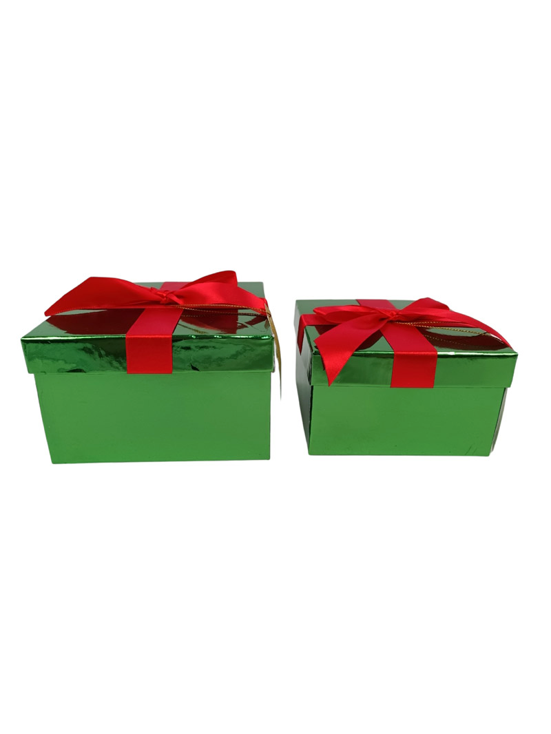 Χριστουγεννιάτικα κουτιά δώρου χάρτινα σετ 2τμχ σε πράσινο χρώμα με κόκκινο φιόγκο 14x14x8cm & 12x12x7cm