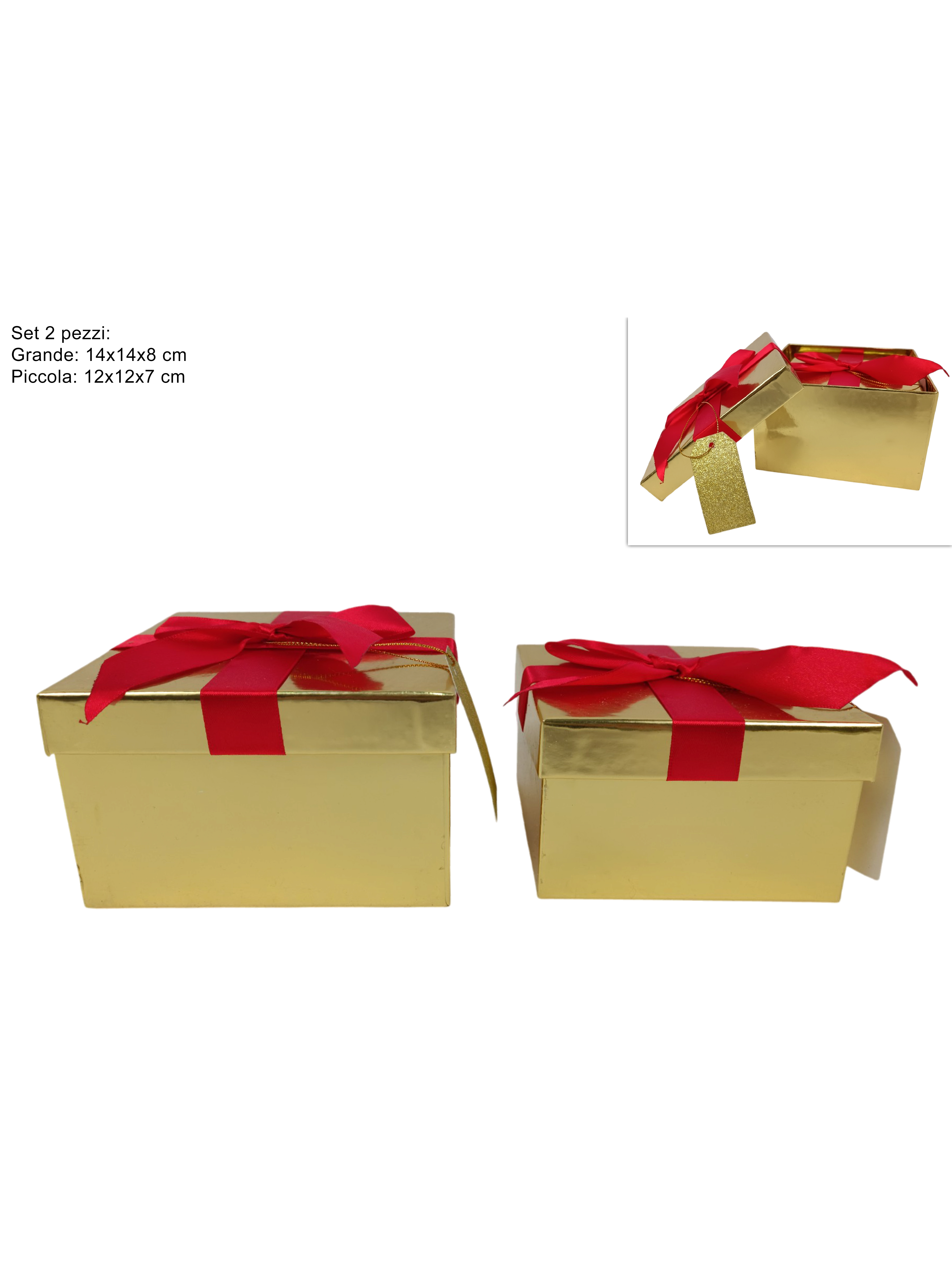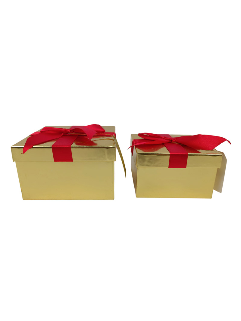 Χριστουγεννιάτικα κουτιά δώρου χάρτινα σετ 2τμχ σε χρυσό χρώμα με κόκκινο φιόγκο 14x14x8cm & 12x12x7cm