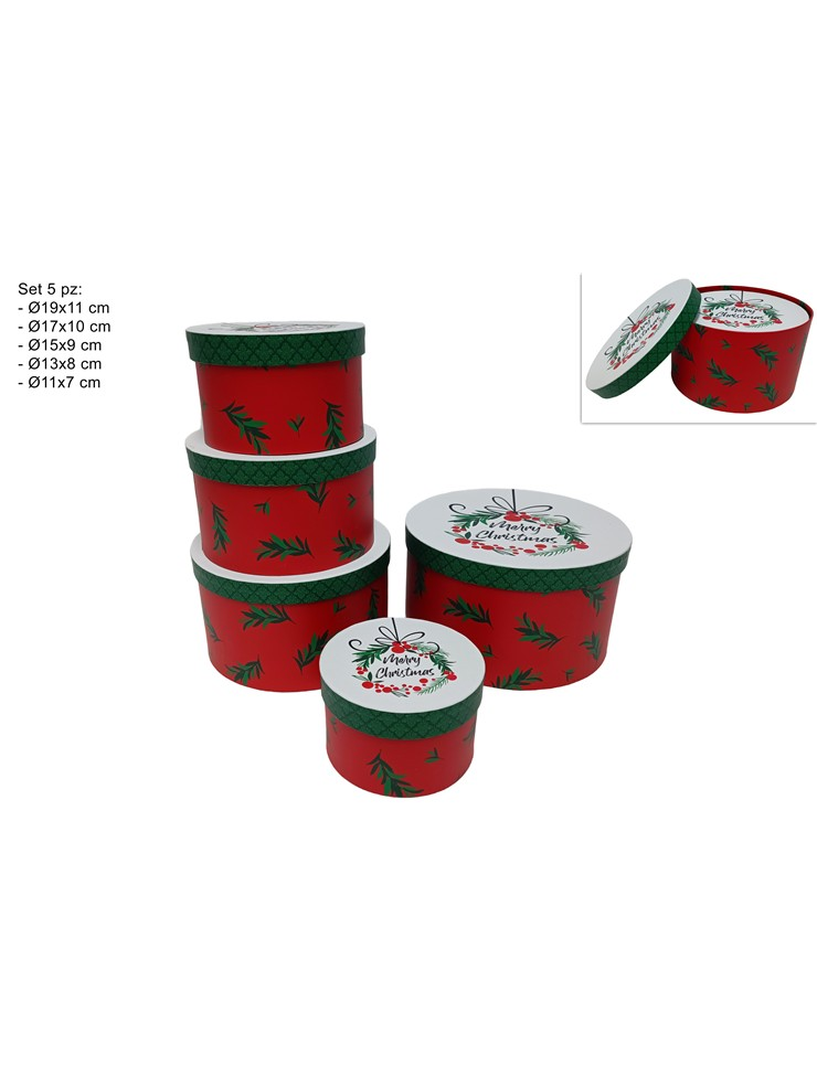 Χριστουγεννιάτικα κουτιά στρόγγυλα σε κόκκινο χρώμα σετ 5τμχ