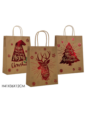 Χριστουγεννιάτικη σακούλα δώρου χάρτινη σε μπεζ χρώμα με κόκκινα σχέδια 36x12x41cm