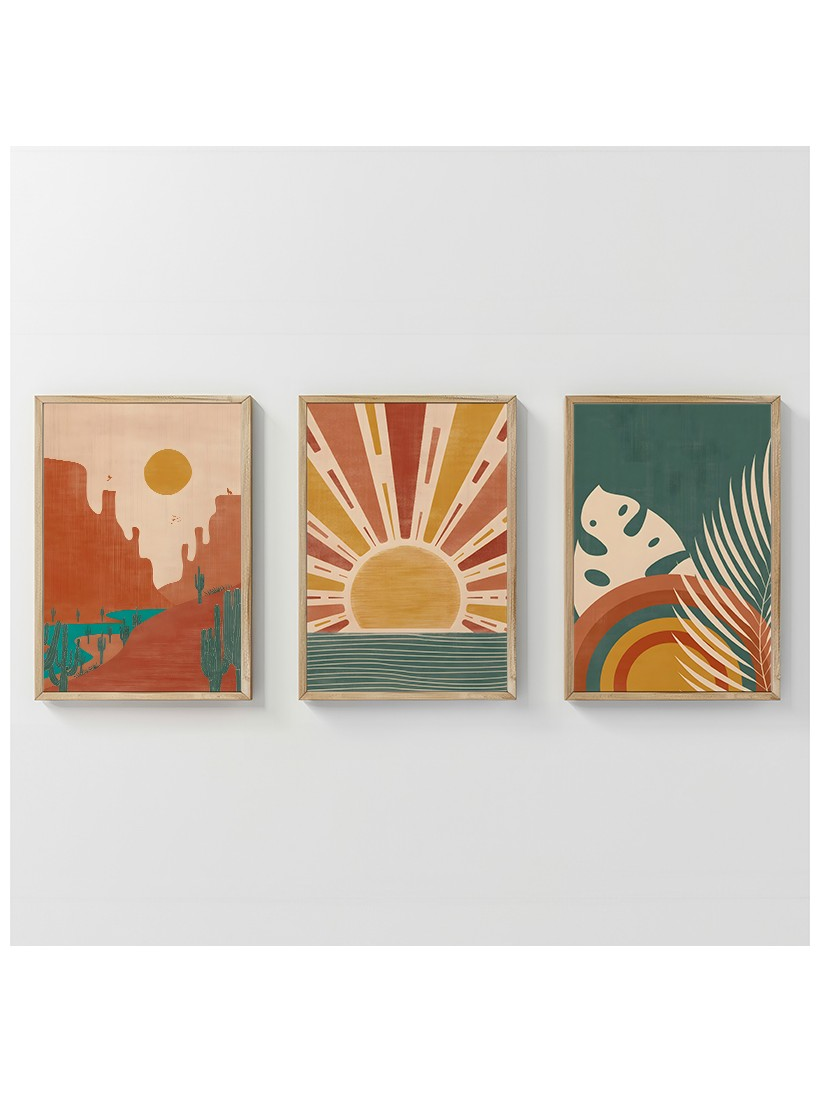 Αφήστε τη φαντασία σας να ταξιδέψει σε εξωτικά τοπία και αφηρημένα γεωμετρικά μοτίβα με αυτό το δυναμικό τρίπτυχο. Το Bemvy αποτελείται από τρεις πίνακες, ο καθένας με ξεχωριστό αλλά αρμονικό θέμα, εμπνευσμένο από vintage και τροπικές επιρροές, δημιουργώντας ένα αποτέλεσμα που είναι ταυτόχρονα μοντέρνο και διαχρονικό.