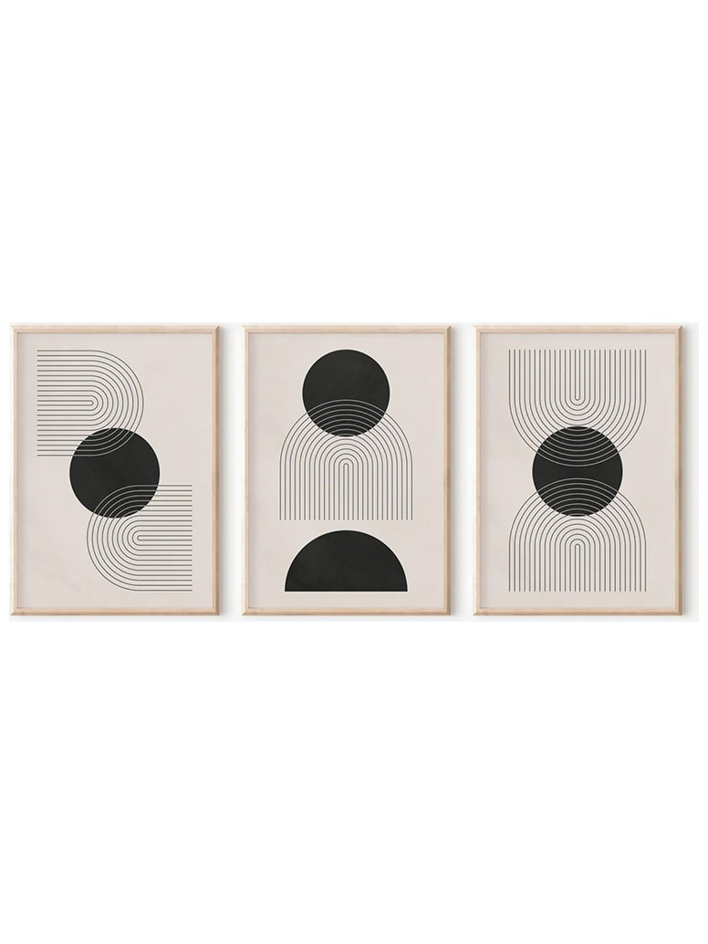 Αυτή η τριπτυχική σύνθεση είναι ιδανική για όσους αναζητούν έναν εντυπωσιακό και μοντέρνο πίνακα με έντονη αντίθεση. Οι αφηρημένες γεωμετρικές μορφές σε μαύρο χρώμα, σε συνδυασμό με τους απαλούς, γήινους τόνους του φόντου, δημιουργούν μια δυναμική και σύγχρονη αισθητική.