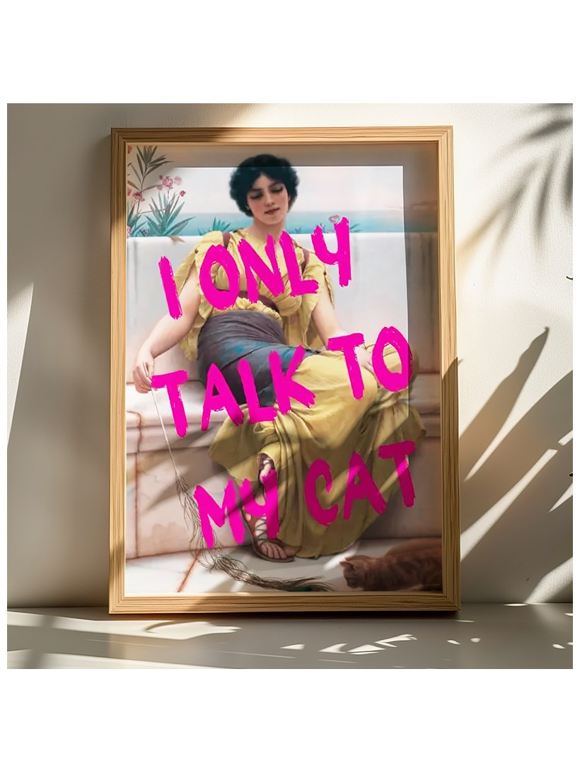 Ο πίνακας Catem είναι ένα εντυπωσιακό και χιουμοριστικό statement piece, ιδανικό για όσους αγαπούν τις γάτες και την μοντέρνα τέχνη. Συνδυάζει την κλασική τέχνη με το σύγχρονο design. Μια κλασική αναπαραγωγή πορτρέτου γυναίκας σε vintage ενδυμασία, καθισμένη με μια γάτα στα πόδια της. Η φράση "I ONLY TALK TO MY CAT" (Μιλάω μόνο στη γάτα μου) εμφανίζεται σε έντονα, ροζ γράμματα πάνω από την κεντρική φιγούρα. Το μήνυμα είναι μια χαριτωμένη, υπερβολική αναφορά στην αγάπη για τα κατοικίδια, προσδίδοντας χιούμορ και μια ανάλαφρη διάθεση στον χώρο.