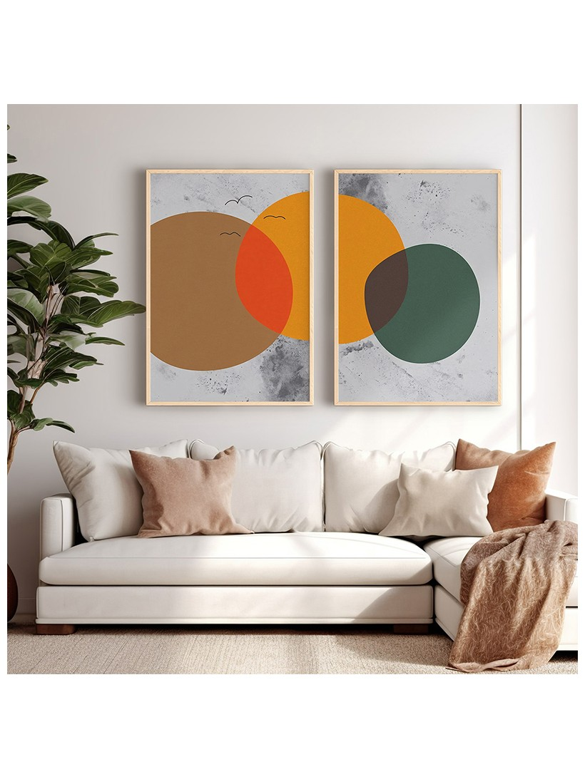 Αναζητάτε την τέχνη που μιλάει τη γλώσσα του σύγχρονου design; Το δίπτυχο Derdia είναι η απόλυτη επιλογή για τους λάτρεις του εκλεπτυσμένου μοντερνισμού. Αυτό το σετ δύο πινάκων δεν είναι απλώς διακόσμηση, είναι μία αισθητική δήλωση που αποπνέει ήρεμη δύναμη και αψεγάδιαστη αρμονία. Κάθε φορά που το βλέμμα σας εστιάζει στα επικαλυπτόμενα, οργανικά σχήματα –το πλούσιο καφέ της γης, το ζεστό πορτοκαλί του ήλιου και το βαθύ πράσινο του δάσους– νιώθετε μια αίσθηση ισορροπίας, ζεστασιάς και δημιουργικής πληρότητας. Το έργο συμβολίζει τη σύνδεση των αντιθέσεων, την απλότητα και τη γοητεία της φυσικής γεωμετρίας. Είναι η οπτική υπενθύμιση ότι η πολυτέλεια κρύβεται στην καθαρή γραμμή.