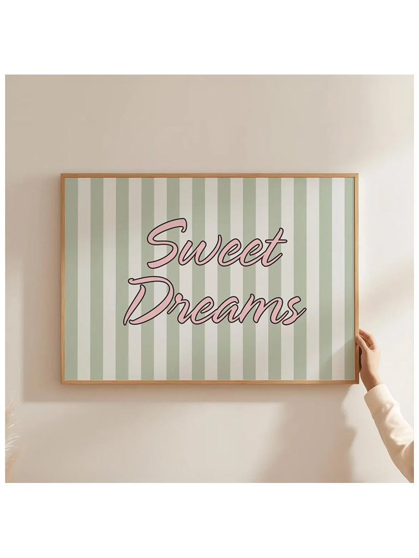 Δημιουργήστε ένα χαλαρωτικό και ονειρικό σκηνικό, ιδανικό για το παιδικό ή το υπνοδωμάτιο, με τον γλυκό πίνακα Deremy. Ο πίνακας αυτός φέρει το μήνυμα "Sweet Dreams" με απαλές, ροζ γραμματοσειρές πάνω σε ένα φόντο με πράσινες-μέντας και λευκές ρίγες. Είναι το τέλειο κομμάτι για να προσθέσετε μια νότα Hygge και Scandi αισθητικής στον χώρο.