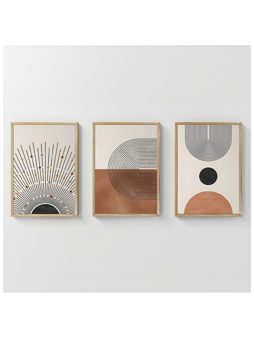 Εισάγετε στον χώρο σας την τέλεια ισορροπία της γεωμετρικής σύνθεσης με τη ζεστασιά των γήινων χρωμάτων. Το τρίπτυχο Jemba είναι μία αισθητική δήλωση που αποδομεί τη φόρμα σε τρία ξεχωριστά, αλληλεπιδρώντα τεμάχια. Κάθε πίνακας παρουσιάζει αφηρημένα γεωμετρικά στοιχεία – λεπτές γραμμές που διαχέονται ακτινωτά, σκούρο μαύρο και ζεστό terracotta. Η παλέτα είναι πολύχρωμη, συνδυάζοντας το γήινο με το αυστηρό μαύρο και το ουδέτερο/μπεζ φόντο. Αυτή η τριπλή διάταξη προσδίδει βάθος, δυναμισμό και υψηλή αισθητική στον χώρο.