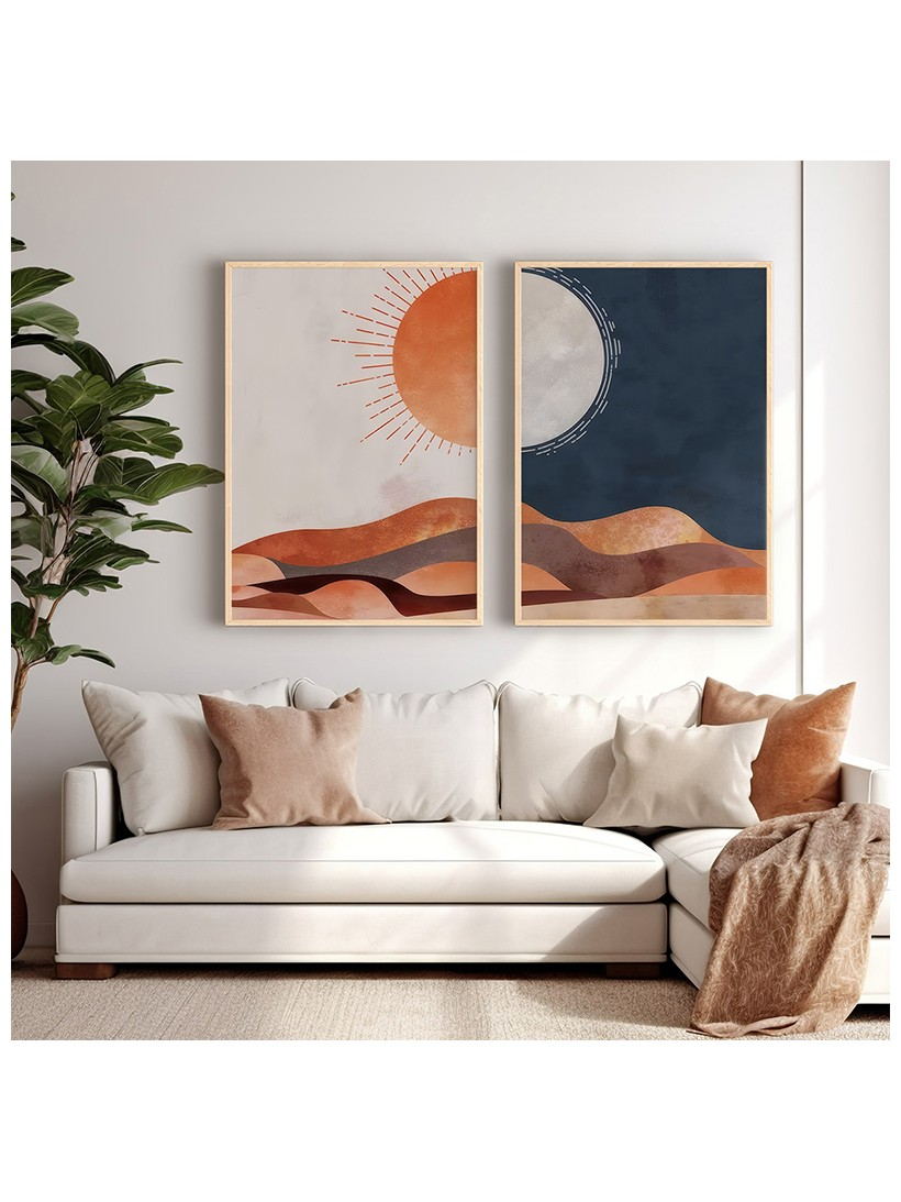 Αφήστε τη ζεστασιά των γήινων τόνων και την αρχέγονη γαλήνη της ερήμου να γεμίσει τον χώρο σας. Το δίπτυχο Lebrano δεν είναι απλώς διακόσμηση, είναι μία αισθητική δήλωση που αναπαριστά τους κύκλους της φύσης (ήλιος/φεγγάρι, μέρα/νύχτα) πάνω από ένα minimal, αφηρημένο τοπίο αμμόλοφων. Κάθε φορά που το βλέμμα σας εστιάζει στους ζεστούς, κεραμιδί-πορτοκαλί τόνους και το βαθύ μπλε, νιώθετε μια αίσθηση ισορροπίας, πνευματικής ηρεμίας και τροπικής πολυτέλειας. Το έργο συμβολίζει τον αιώνιο κύκλο, τη σταθερότητα και τη διακριτική γοητεία του μοντέρνου Bohemian στυλ.