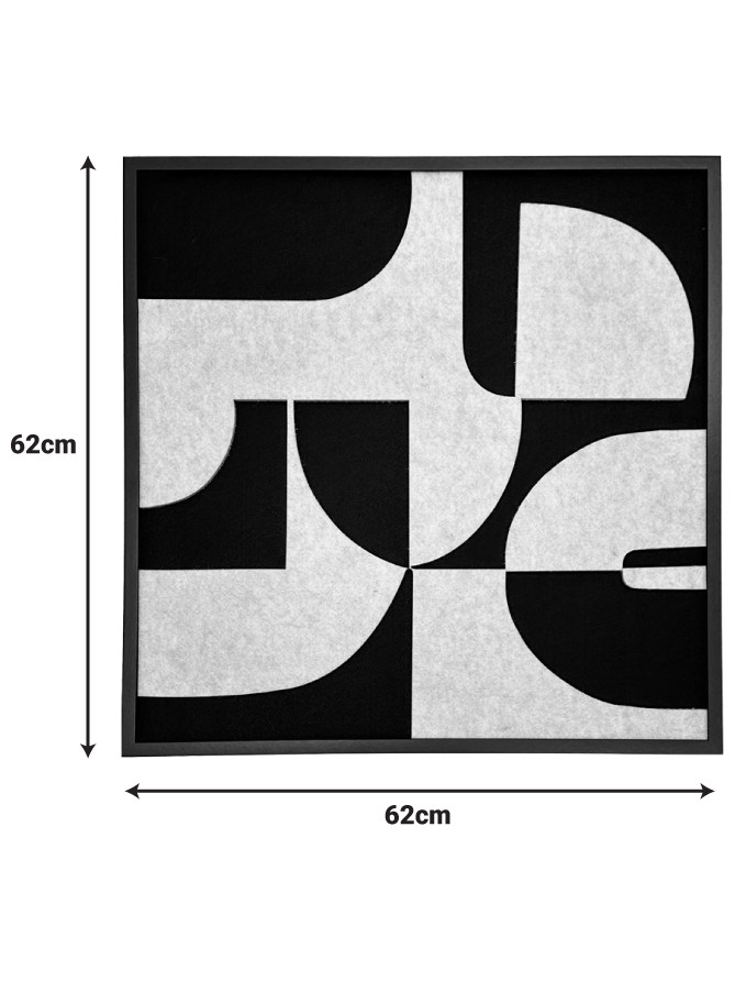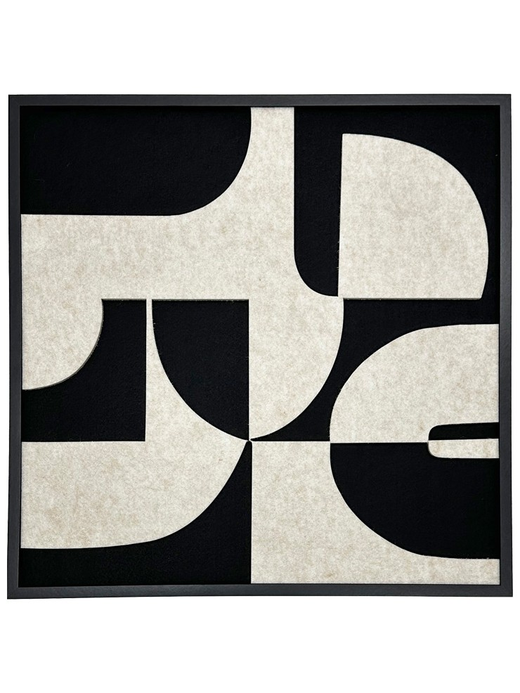 Το εξαιρετικό έργο τέχνης Jeire , διαθέτει μια μοντέρνα, αφηρημένη σύνθεση. Το έργο παρουσιάζει ένα δυναμικό μοτίβο γεωμετρικών και οργανικών σχημάτων σε έντονη ασπρόμαυρη αντίθεση. Τα ανάγλυφα στοιχεία της ανοιχτόχρωμης τσόχας αναδεικνύονται ενάντια στο βαθύ μαύρο φόντο, προσδίδοντας στο κομμάτι μια εντυπωσιακή τρισδιάστατη υφή και οπτικό βάθος. Το σύνολο πλαισιώνεται από ένα λιτό, μαύρο πλαίσιο, τονίζοντας τον μινιμαλιστικό και κομψό χαρακτήρα του.