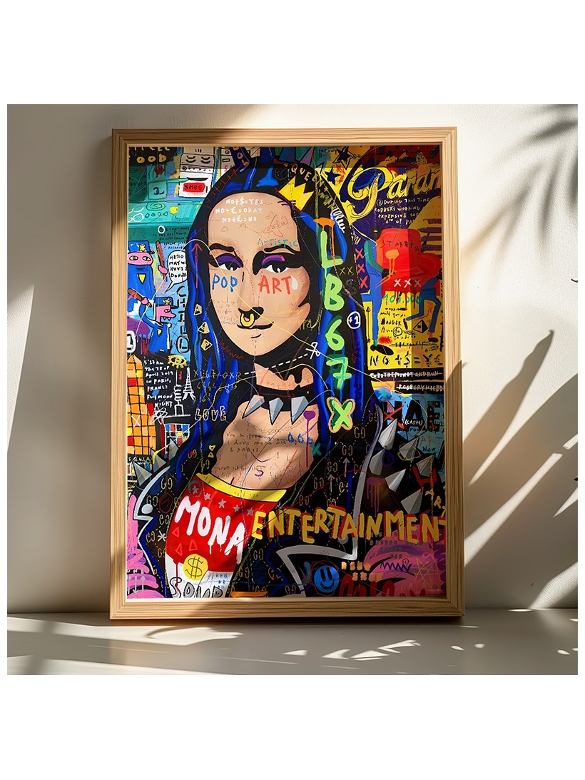 Ο πίνακας Monda είναι ένα εκρηκτικό, Pop-Art και δυναμικό έργο τέχνης που συγκρούει την αριστοκρατία της κλασικής ζωγραφικής με την σύγχρονη κουλτούρα του Street Art και των Graffiti. Απεικονίζεται η κεντρική φιγούρα από το διάσημο έργο του Leonardo da Vinci, "Mona Lisa", σε ένα πολύχρωμο και ατίθασο ρετουσάρισμα. Διατηρούνται τα κλασικά στοιχεία του πορτρέτου, ενώ η έκφρασή της έχει τροποποιηθεί με μοντέρνα και χρωματιστά στοιχεία. Ο πίνακας είναι γεμάτος με έντονα χρώματα, σύμβολα, λέξεις (όπως "ENTERTAINMENT"), και γραμμές που θυμίζουν τοίχο γεμάτο graffiti. Είναι ιδανικός για να λειτουργήσει ως το κεντρικό σημείο εστίασης σε κάθε δωμάτιο, προσδίδοντας προσωπικότητα, ζωντάνια και έναν μοντέρνο/Colorful τόνο.