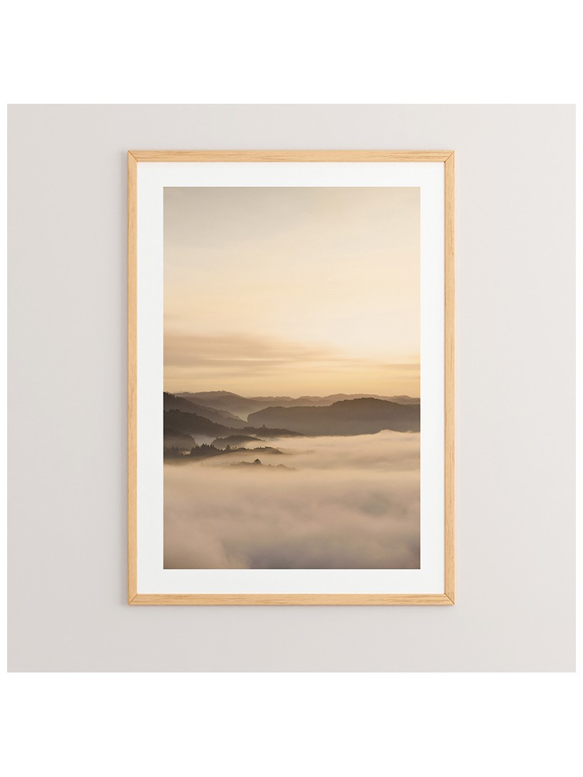 Αφεθείτε στη γοητεία ενός πίνακα που αιχμαλωτίζει το μοναδικό θέαμα ενός τοπίου βυθισμένου στην ομίχλη. Η φωτογραφία αποτυπώνει την αίσθηση του πρωινού, με τους λόφους να ξεπροβάλλουν μέσα από ένα απαλό, ομιχλώδες πέπλο που καλύπτει την κοιλάδα, δημιουργώντας ένα παιχνίδι φωτός και σκιάς που αγγίζει την καρδιά.
