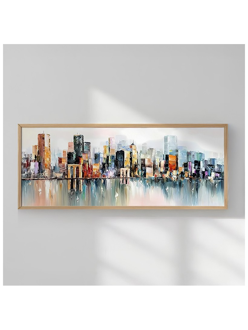 Ανακαλύψτε αυτόν τον εντυπωσιακό, πανοραμικό πίνακα Teria που αποτυπώνει ένα αφηρημένο αστικό τοπίο. Η εκτύπωση μιμείται την αισθητική της ελαιογραφίας με χοντρές, γεμάτες χρώμα πινελιές, οι οποίες αντικατοπτρίζονται στο νερό από κάτω.