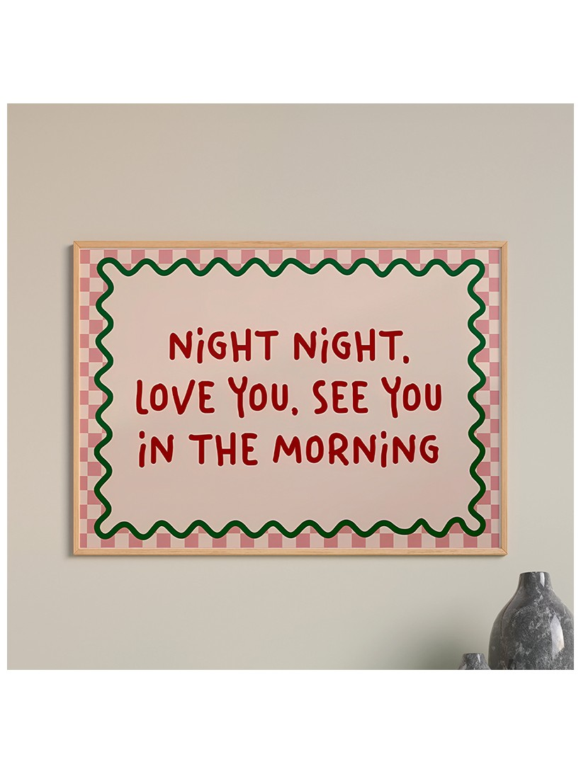 Ο πίνακας Tharis είναι ένα γλυκό και τρυφερό διακοσμητικό στοιχείο, ιδανικό για να κοσμήσει το υπνοδωμάτιο, το παιδικό δωμάτιο ή έναν χώρο χαλάρωσης. Η εκτύπωση διαθέτει μια γλυκιά καληνύχτα σε κόκκινα γράμματα, πλαισιωμένη από ένα παιχνιδιάρικο, κυματιστό περίγραμμα σε πράσινο και ροζ χρώμα.