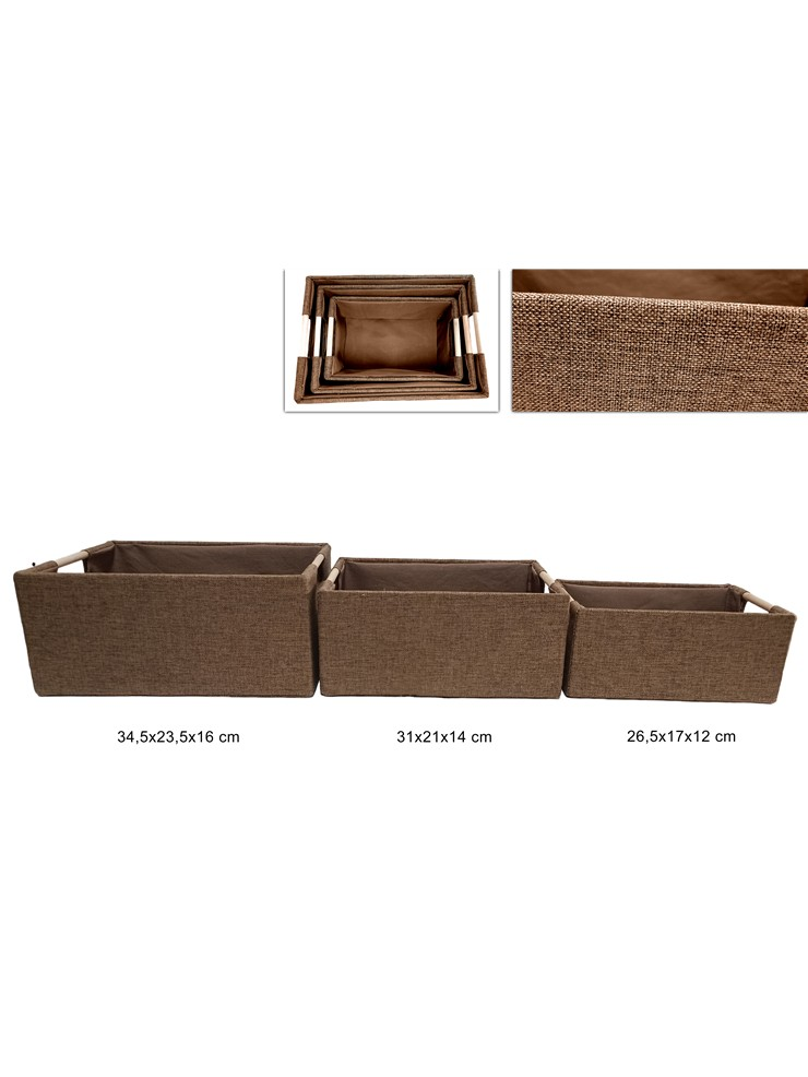 Σετ 3 καλάθια αποθήκευσης υφασμάτινα με ξύλινες λαβές σε καφέ χρώμα 34.5x23.5x16cm, 31x21x14cm &26.5x17x12cm