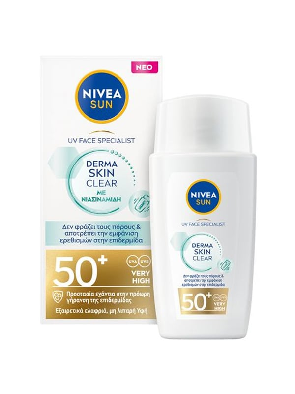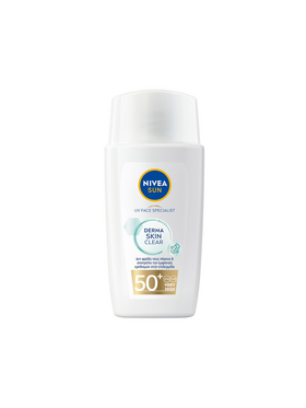 Nivea Sun UV Face Derma Skin Clear Αντηλιακό Προσώπου με Νιασιναμίδη SPF 50+ Η αντηλιακή κρέμα προσώπου NIVEA SUN UV Face Derma Skin Clear SPF50+ είναι ειδικά σχεδιασμένη για την ευαίσθητη επιδερμίδα του προσώπου. Προστατεύει την επιδερμίδα εξωτερικά από τις ακτίνες UVA/UVB και από τις επιπτώσεις της Ορατής Ακτινοβολίας Υψηλής Ενέργειας (HEVL), όπως η πρόωρη γήρανση της επιδερμίδας. Επιπλέον προστατεύει την επιδερμίδα εκ των έσω χάρη σε ένα ισχυρό φυσικό αντιοξειδωτικό που ενεργοποιεί τον αμυντικό μηχανισμό της ίδιας της επιδερμίδας. Η ήπια μη-λιπαρή σύνθεση με σύμπλεγμα Anti-Blemish + Νιασιναμίδη προστατεύει και αποτρέπει τις ατέλειες απορροφώντας την λιπαρότητα από τον επιδερμικό φραγμό. Παρέχει ματ αποτέλεσμα για 8 ώρες για μη-λιπαρή όψη της επιδερμίδας, αίσθηση ενυδάτωσης και υγιή όψη της επιδερμίδας. Η ελαφριά και μη λιπαρή του σύνθεση με 0% κολλώδη αίσθηση το καθιστά ιδανικό για καθημερινή χρήση. Αναπτύχθηκε για κανονικούς/μικτούς τύπους επιδερμίδας. Η σύνθεσή του είναι οφθαλμολογικά ελεγμένη (φιλική προς τα μάτια). Συμβατότητα με την επιδερμίδα δερματολογικά ελεγμένη. Το NIVEA SUN στοχεύει στην ελαχιστοποίηση των επιπτώσεων στο περιβάλλον. Η σύνθεσή του είναι 64% βιοδιασπώμενη και σέβεται τη θάλασσα καθώς είναι απαλλαγμένη από φίλτρα UV Octinoxate, Oxybenzone & Octocrylene και χωρίς μικροπλαστικά. Το σωληνάριο και το καπάκι είναι από 50% ανακυκλωμένο πλαστικό. Κουτί από FSC εγκεκριμένο χαρτόνι. Πολύ ελαφρύ, μη λιπαρό και ενυδατικό αντηλιακό με υαλουρονικό που απορροφάται αμέσως και αφήνει διάφανο αποτέλεσμα στην επιδερμίδα – κατάλληλο για χρήση κάτω από το make-up & ανθεκτικό στο νερό. Προτείνεται για κανονικές, μικτές και ευαίσθητες επιδερμίδες. Συμβατότητα με την επιδερμίδα δερματολογικά ελεγμένη. Σύνθεσή 76% βιοδιασπώμενη, χωρίς Octinoxate, Oxybenzone & Octocrylene και μικροπλαστικά. ΧΡΗΣΗ Εφαρμόστε αρκετή ποσότητα πριν απο την έκθεση στον ήλιο. Ανανεώνετε συχνά, ειδικά μετά το κολύμπι, την εφίδρωση και το σκούπισμα, για να διατηρήσετε την αρχική προστασία. Η μείωση της ποσότητας θα μειώσει σημαντικά το επίπεδο προστασίας. Μην εκτίθεστε για πολλή ώρα στον ήλιο, ακόμα και μετά τη χρήση αντηλιακού προϊόντος. Η υπερβολική έκθεση στον ήλιο αποτελεί σοβαρή απειλή για την υγεία. Μην αφήνετε τα βρέφη και τα μικρά παιδιά να εκτίθενται άμεσα στην ηλιακή ακτινοβολία. Αποφεύγετε την επαφή με τα μάτια. Αποφύγετε την άμεση επαφή με υφάσματα και σκληρές επιφάνειες για να αποφύγετε τους λεκέδες. Ανακινείστε καλά πριν την χρήση.